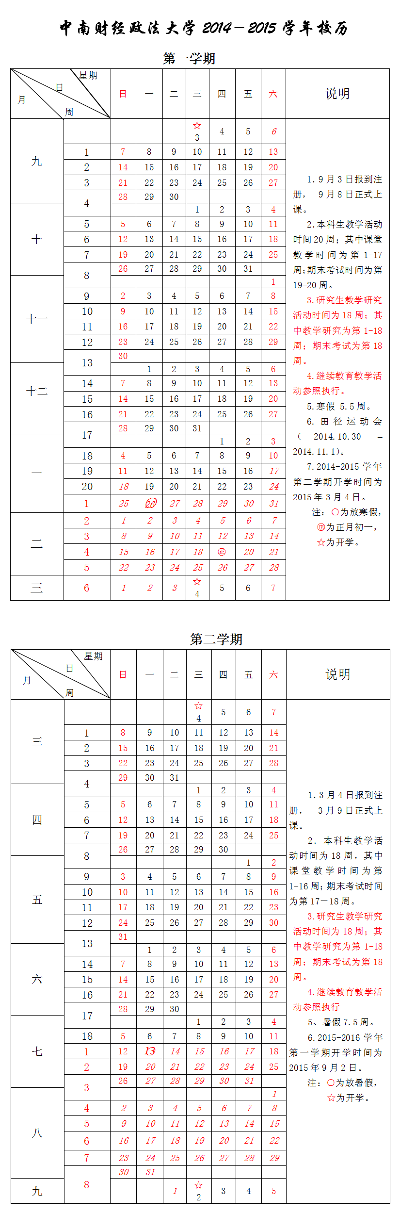 中南财经政法大学2014-2015学年校历