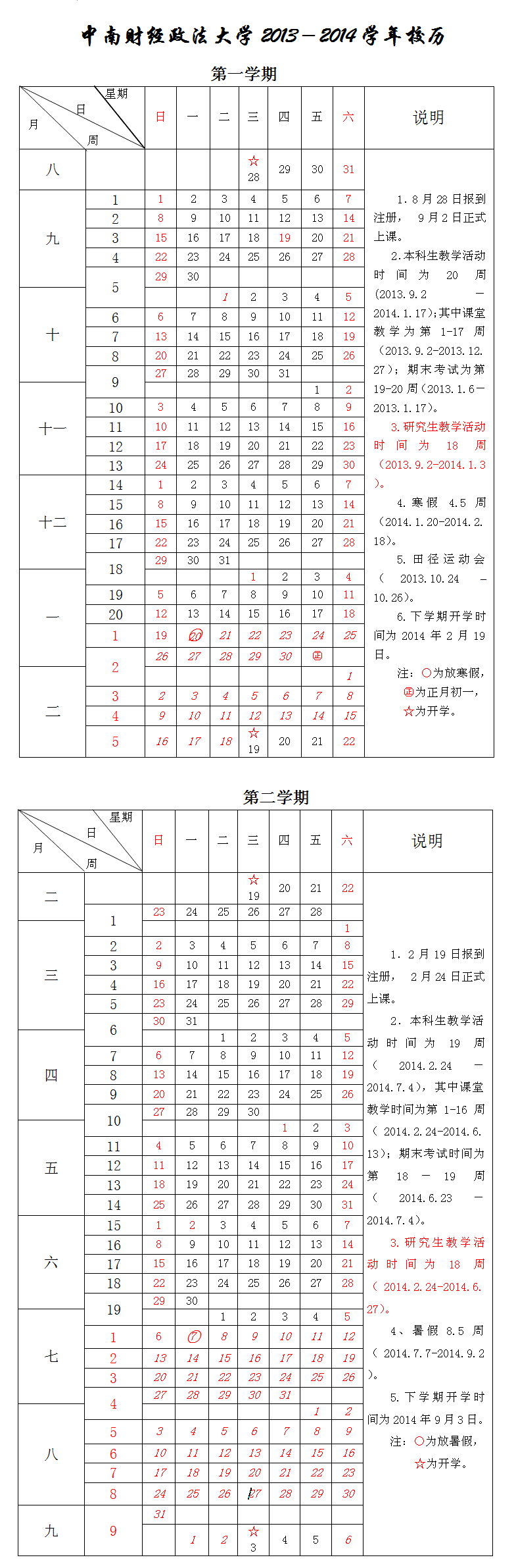 中南财经政法大学2013-2014学年校历