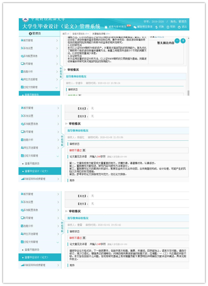 学校要求不受疫情影响、通过网络方式按原计划开展的毕业论文指导也正按部就班、平稳有序地进行着。学生认真开展开题报告提交、论文初稿撰写等,指导教师及时进行指导与批阅。对师生使用论文系统中遇到的问题,各学院、教务部和系统开发客服工作人员通过QQ群、微信等多种方式及时进行答疑。目前使用大学生论文管理系统的学院,论文开题报告完成率达98%,已有521名学生提交了论文初稿。