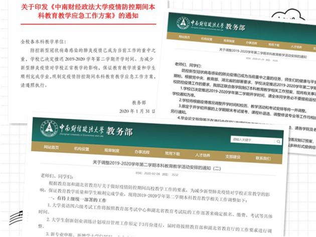 强化领导精准施策。为贯彻落实教育部、湖北省教育厅和学校疫情防控指挥部关于做好防疫期间教学工作的要求,学校高度重视,精心谋划,成立在线教学工作领导小组,统筹推进本科教学工作方案、技术服务保障方案等落细落实。教务部制定《中南财经政法大学疫情防控期间本科教育教学应急工作方案》并发布多个在线教学工作通知;信息管理部密切配合、全员在线,一方面克服困难排解各种网络技术故障,一方面耐心解答教师在实际应用中的各种问题;学生工作部层层压实责任,督促辅导员将有关要求通知到每一位学生;各学院结合课程教学实际,制定切实可行的实施细则,为线上教育教学保驾护航,确保“学生学习不延误、课程质量有保障”。