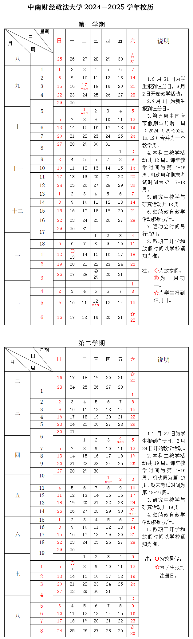 中南财经政法大学2024-2025学年校历